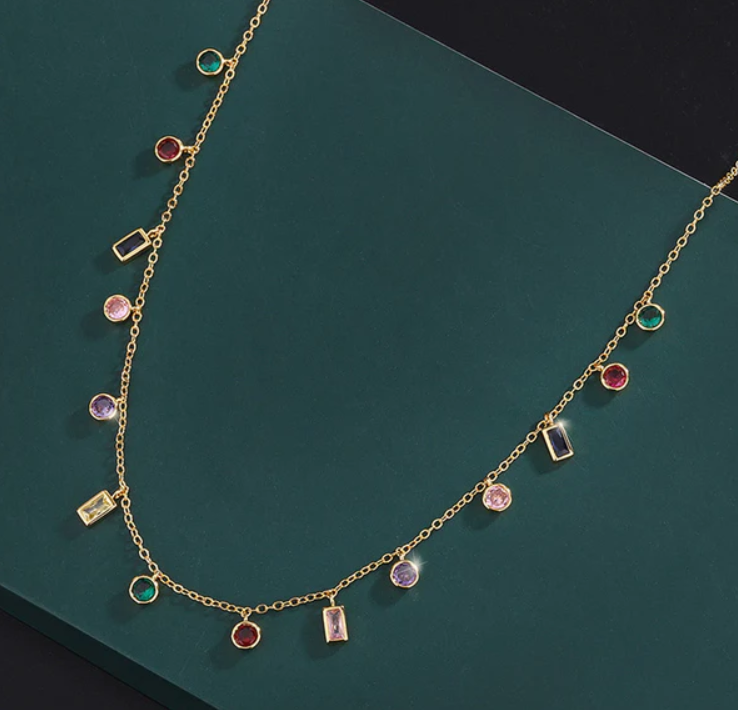 Elevate your style with this Elegant Multicolor Gemstone Charm Necklace! Delicately crafted with a fine gold-plated chain, this necklace features a beautiful array of colorful gemstone charms in round and rectangular cuts. Each stone adds a playful yet sophisticated touch, making it the perfect accessory for both casual and formal occasions.