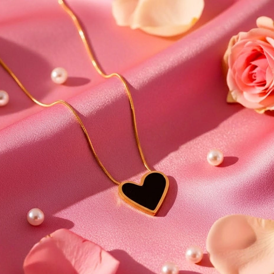 A striking black enamel heart framed in gold — bold, elegant, and timeless.